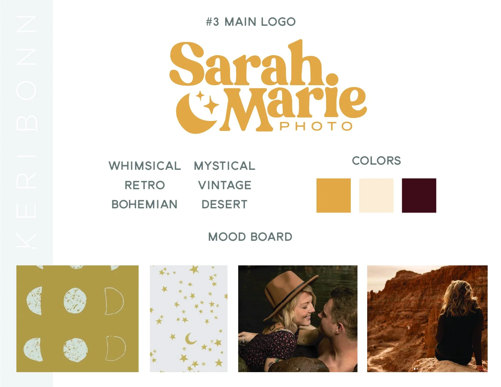 I started the process with a few mood boards to try and learn the aesthetic that she was going for. Working off of a Pinterest board Sarah had put together, I created seven different mood boards consisting of the logo that would go with this aesthetic, description words, color, and images from both the Pinterest board and from Sarah's own photography.